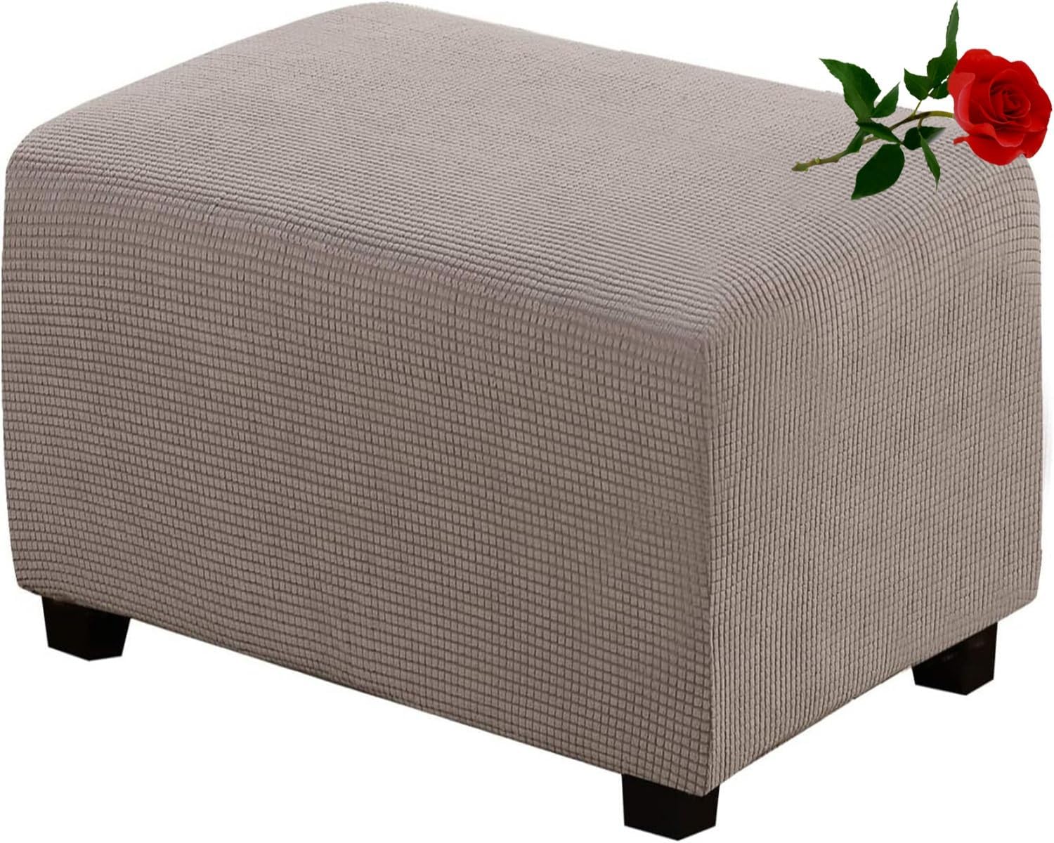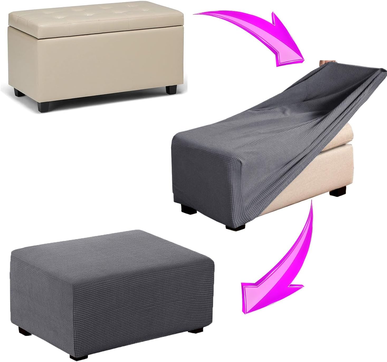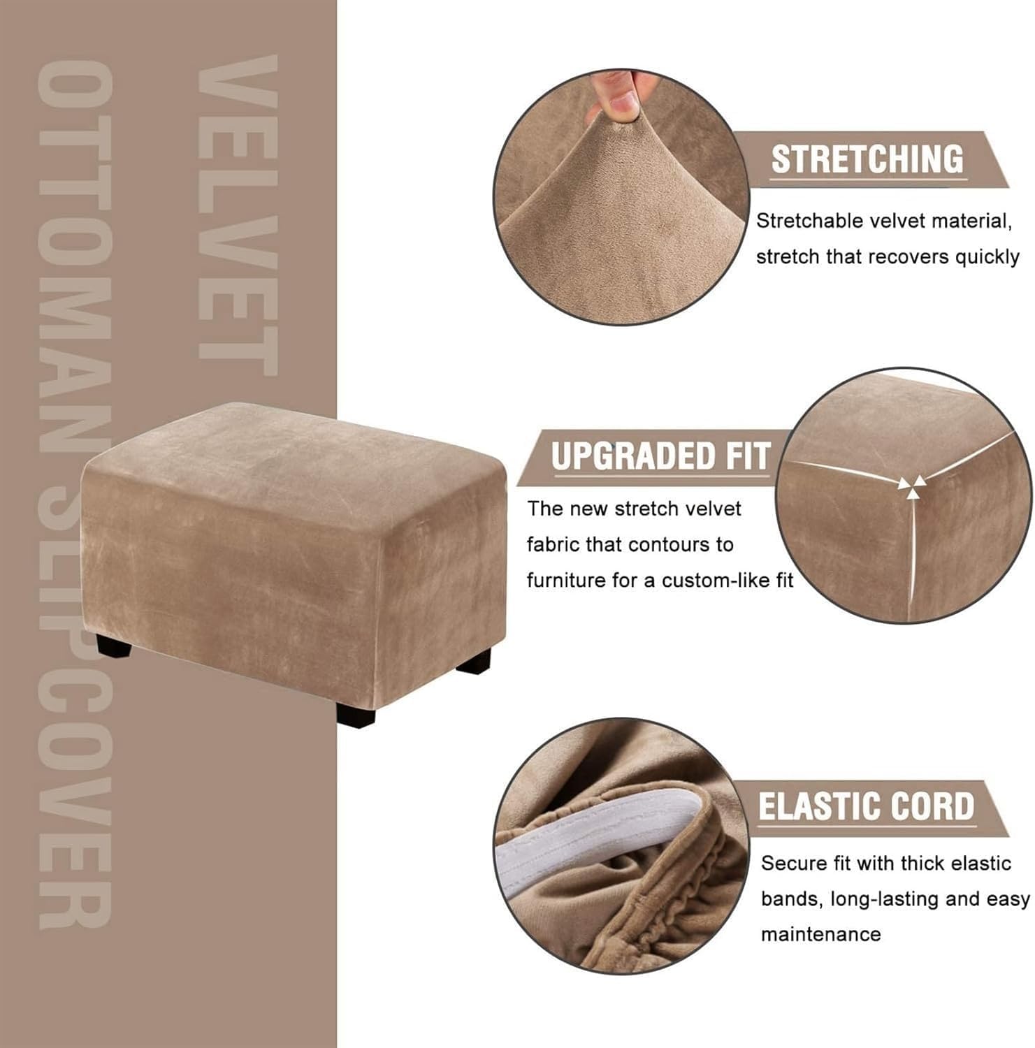 Fabric: Our ottoman covers are made of highQuality 85% polyester and 15% Spandex fabric, which provides exceptional softness, comfort, and stretchability. TheUnique dyeing technology ensures that the slipcovers will not fade even after long-term use. The covers are designed to fit your ottoman perfectly, covering every edge withGreat elasticity that fits most types of ottomans.Upgraded Fit and Decoration: With our premium design, our soft ottoman slipcovers feature a nonSlip, thick, and wear-resistant velvet pattern that can fit your ottoman perfectly and become a centerpiece in your living room. The elastic thicken bands ensure that the fitted ottoman covers will not easily move or shift after use, providing better protection.Protect Your Ottoman: Our stretch ottoman slipcovers provide full coverage for your ottoman footstool, protecting it from daily stains and wear and tear. They are especially greatFor homes with pets or anyone seeking an economical way to protect their furniture. The solid color options we provide make it easy to coordinate with your space decor.Easy to Install & Maintain: Installing our ottoman slipcovers is easy. Begin from the backside, making sure it covers the entireItem, then move it slowly down to fit over the product to ensure a proper fit. Our slipcovers are machine washable in cold water, which saves you time onCleaning and bill costs. They are also wrinkle-not for easy maintenance. Do not bleach, tumble dry low, and do not iron.Ottoman Covers Feature :1. These ottoman slipcovers could help protect your furniture from daily tears, spills, stains, and so on.2.This 1 piece ottoman cover is crafted fromDurable and soft high stretch polyester fabric.3.Ottoman covers are super soft and comfortable. Easy to install and remove.4.Lots of size optional, suitable for most rectangular and 5 sided storage ottomansPackage Contents: 1 footstool cover, not including ottomanThank you for your visi